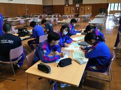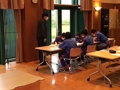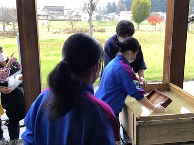 2023年11月10日 19時13分雨が降る肌寒い中、出ヶ原和紙職人の方々のサポートのもと、卒業証書となる和紙づくりを行いました。今日は、昨日までに仕込んだ和紙の原料と水、ネリを入れたすき船の中で、簀桁ですくって縦横にゆらし、一人ずつ紙すきを行いました。3年生は、これまでに経験したことがあるかのように上手に紙すきを行いました。また、順番を待っている生徒たちは、パワーアップテストの計画立てや、自主勉強を真剣に行っていました。サポートしてくださった職人の皆様、本当にありがとうございました。この和紙が一人ひとりの手に渡るのは、卒業式の日となります。